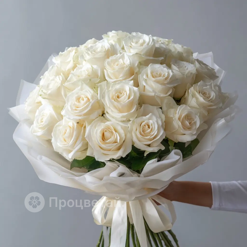 Нежный и лёгкий букет из белых роз, словно облака с каплей утреннего аромата. Прекрасен как подарок для романтических случаев или в качестве комплимента без повода. Сочетает свежесть и деликатность.