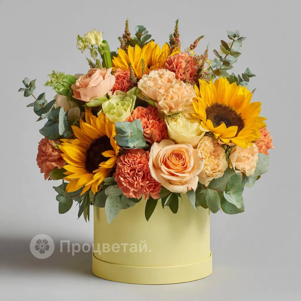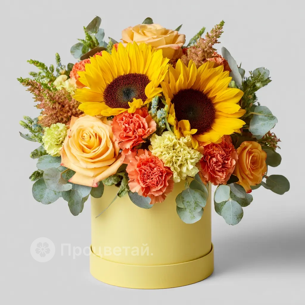 Подсолнухи, оранжевые гвоздики и кремовые розы — яркая палитра для теплых осенних дней.