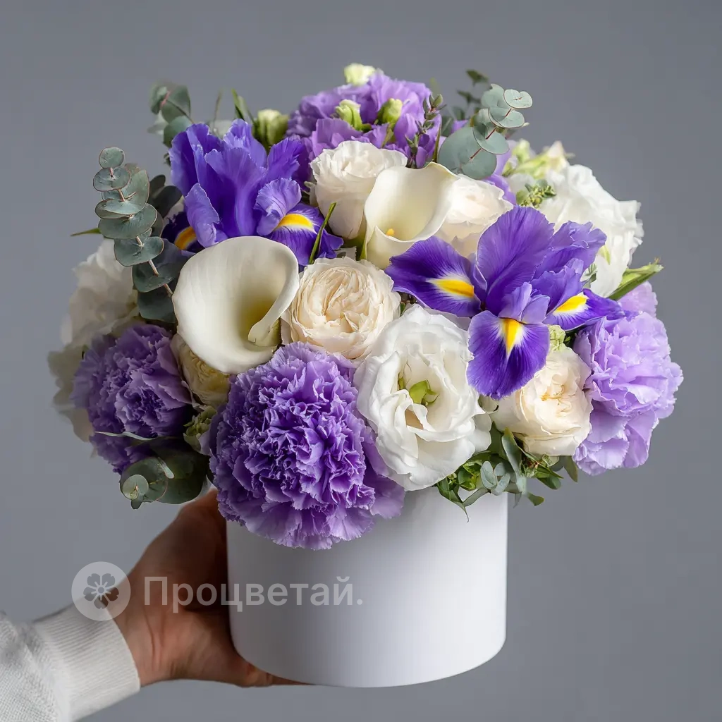 Белые каллы, фиолетовые ирисы и гвоздики создают мягкую, романтичную атмосферу для особых вечеров.