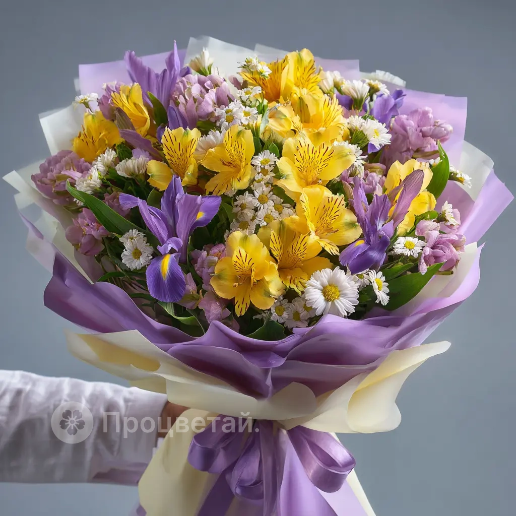 Композиция в жёлто-фиолетовой гамме — как всплеск света в пасмурный день. Альстромерии создают ощущение тепла и оптимизма. Прекрасно подойдёт для поднятия настроения или неожиданного подарка.