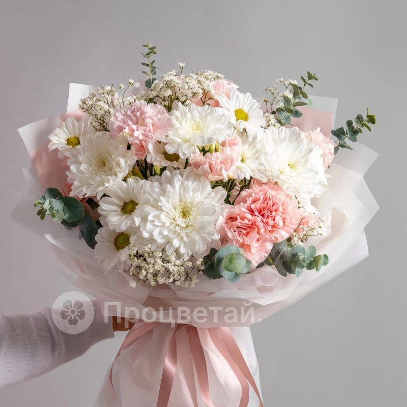 Яркий букет с гвоздиками и хризантемами, украшенный зеленью, идеально подойдет для праздника или чтобы поднять настроение близким.
