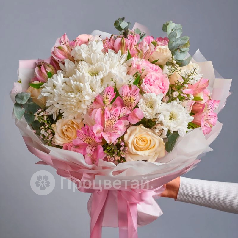Сдержанная композиция в светлой гамме с белыми, кремовыми и розовыми оттенками. Хризантемы символизируют чистоту и уважение, а оформление делает букет универсальным для любого случая.