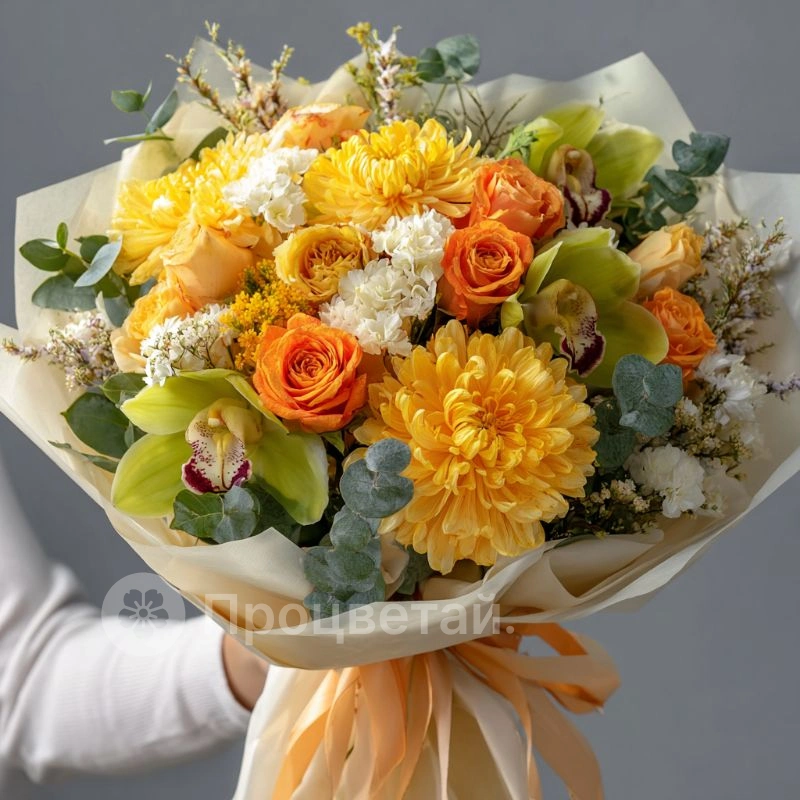ГлавнаяКаталогБукетыБукет с хризантемами «Классика тепла»