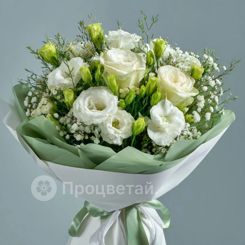 Белоснежная гамма и тонкие стебли — словно звон хрустального ветра. Эустомы придают композиции воздушность и элегантность. Букет, который говорит о любви, уважении и заботе.